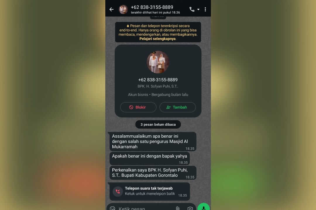 “Telah beredar sebuah nomor WhatsApp yang mengaku sebagai Bupati Gorontalo dan telah mencoba menghubungi sejumlah pihak,” ujar Safwan.