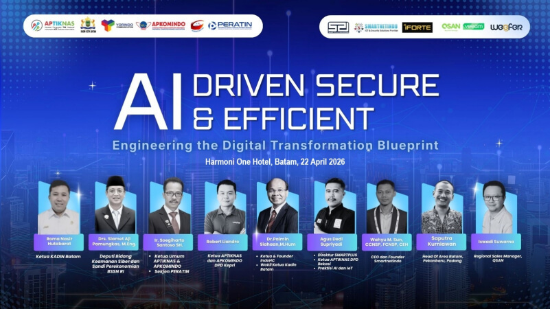 Kegiatan ini juga menghadirkan sejumlah narasumber dan praktisi terkemuka, antara lain Dr. Paimin Siahaan, M.Hum., Agus Dedi Supriyadi (Direktur SMARTTRUS, Ketua APTIKNAS & APKOMINDO DPD Bekasi, Praktisi AI & IoT), Wahyu M. Sun (CEO & Founder Smartnetindo), Saputra Kurniawan (Head of Area Batam, Pekanbaru, Padang), serta Iswadi Suwrana (Regional Sales Manager QSAN). Para narasumber berbagi wawasan strategis mulai dari kebijakan, infrastruktur, hingga implementasi teknologi terkini di lapangan.