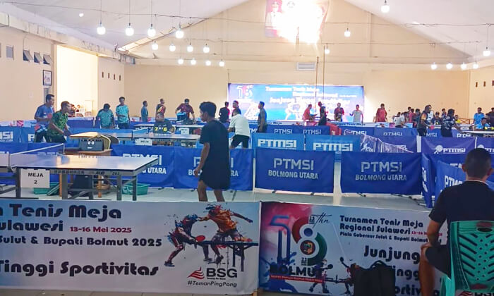 GOSULUT.ID – Kemeriahan perayaan Hari Ulang Tahun (HUT) Kabupaten Bolaang Mongondow Utara (Bolmut) ke-18 semakin terasa dengan digelarnya Open Turnamen Tenis Meja Piala Gubernur dan Bupati.