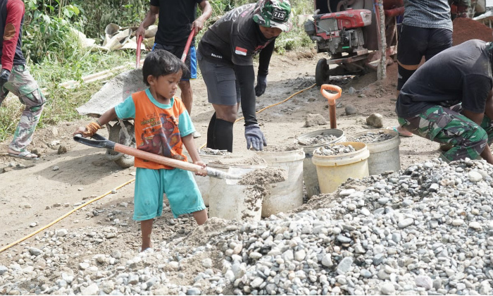 “Saya lihat Bapak-bapak Tentara capek, jadi saya mau bantu biar jalannya cepat jadi. Kalau jalannya bagus, nanti saya setiap harinya berangkat dan pulang dari Sekolah terus bermain sepedanya enak,” ujar Mikail Rafasyah Kadir dengan polosnya, sambil menyeka keringat di dahinya.